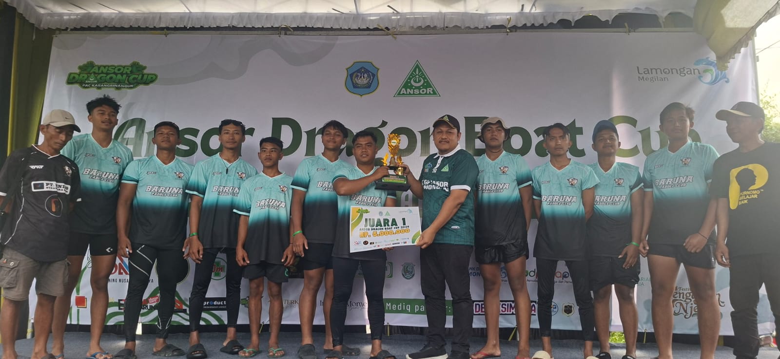 Ajang Ansor Dragon Boat Cup 2026 diikuti oleh 16 tim dari berbagai wilayah di Kabupaten Lamongan. Kompetisi berlangsung sengit dan penuh sportivitas hingga akhirnya Baruna Paddle Club berhasil mendominasi podium dengan meraih juara pertama, kedua, dan ketiga. Sementara posisi keempat diraih oleh Putra Satria Paddle Club.