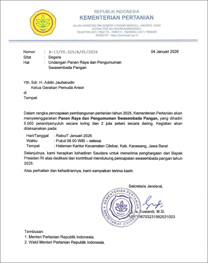 Dalam momentum strategis tersebut, Ketua Umum Gerakan Pemuda Ansor, H. Addin Jauharudin, diundang secara khusus untuk menerima penghargaan langsung dari Presiden Republik Indonesia. Penghargaan ini diberikan atas dedikasi dan kontribusi nyata GP Ansor dalam mendukung pencapaian swasembada pangan nasional tahun 2025.